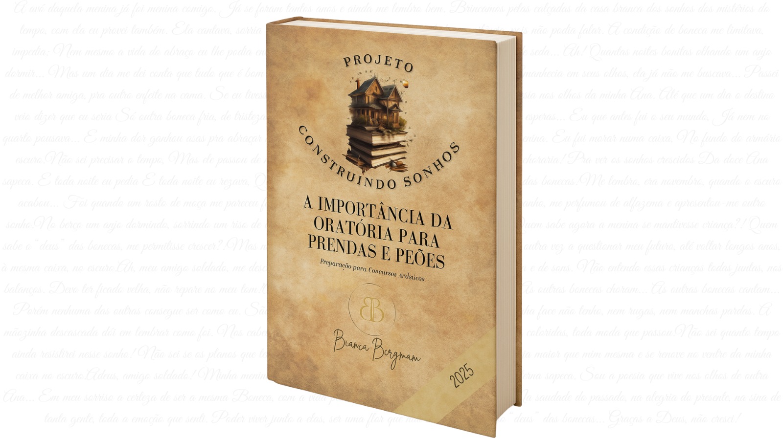 Este e-book foi criado por Bianca Bergmam, artista das palavras com mais de 150 prêmios, jurada de grandes festivais e fundadora do Projeto Construindo Sonhos, responsável pela preparação de centenas de jovens vencedores.